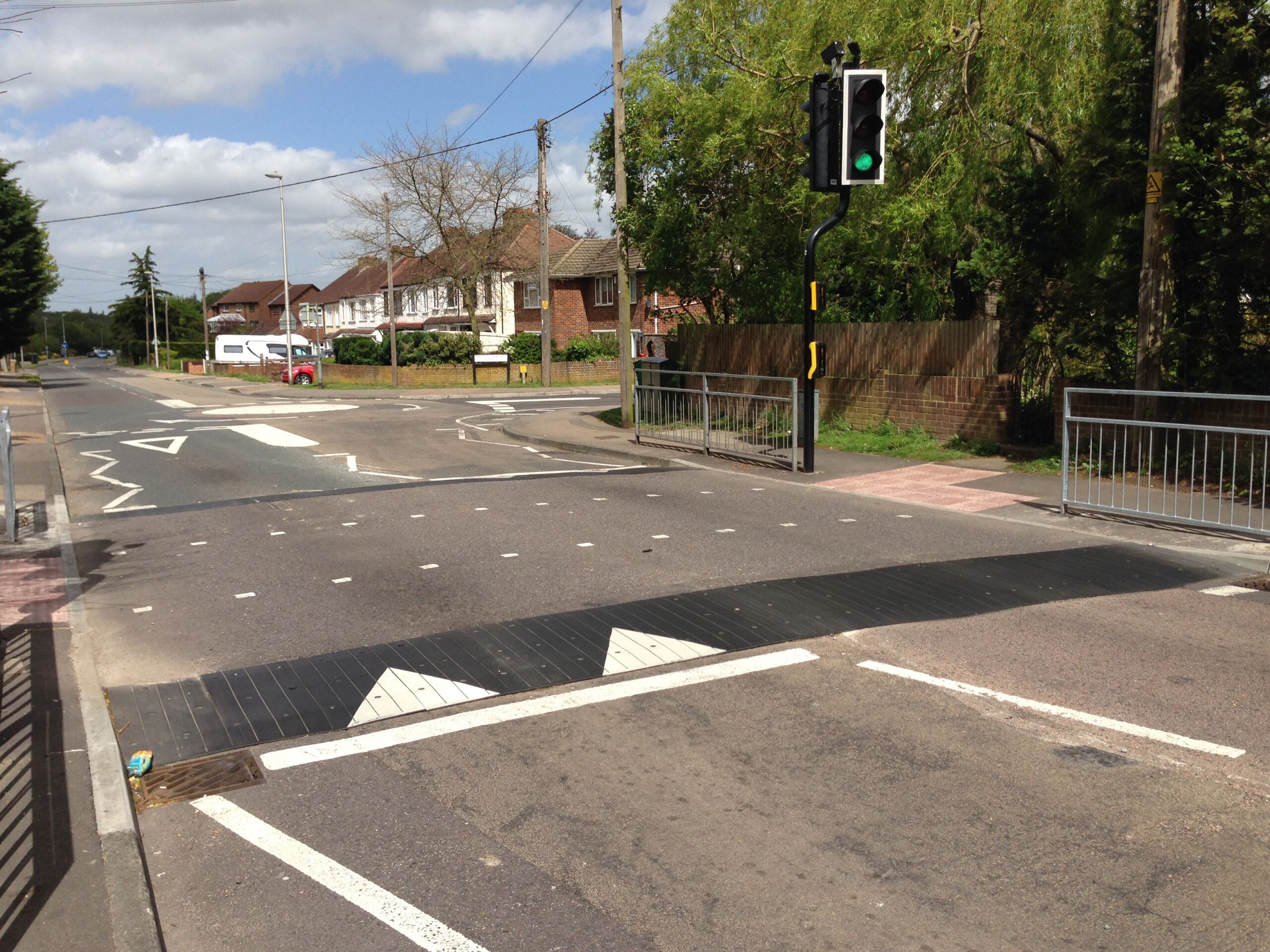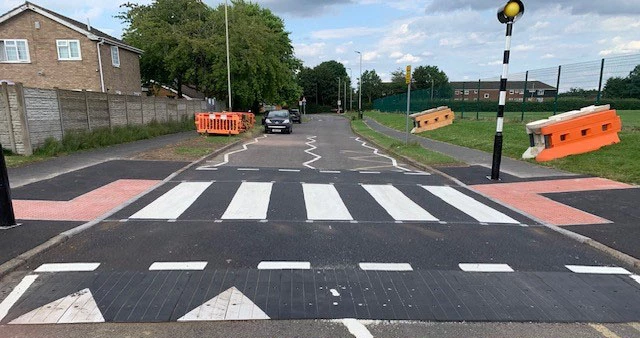 Built from modular recycled rubber units that can be configured to different widths, lengths, and layouts, with tapered or kerb-to-kerb sides to suit crossings, islands, and junctions.